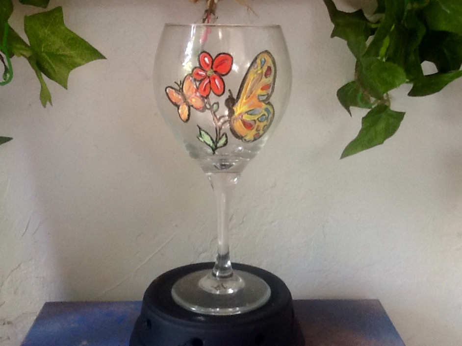 Orange Butterfly and Flowers Wine Glass