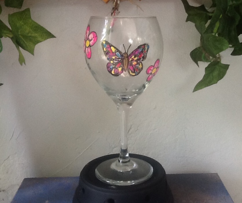 Pink Butterfly and Flowers Wine Glass